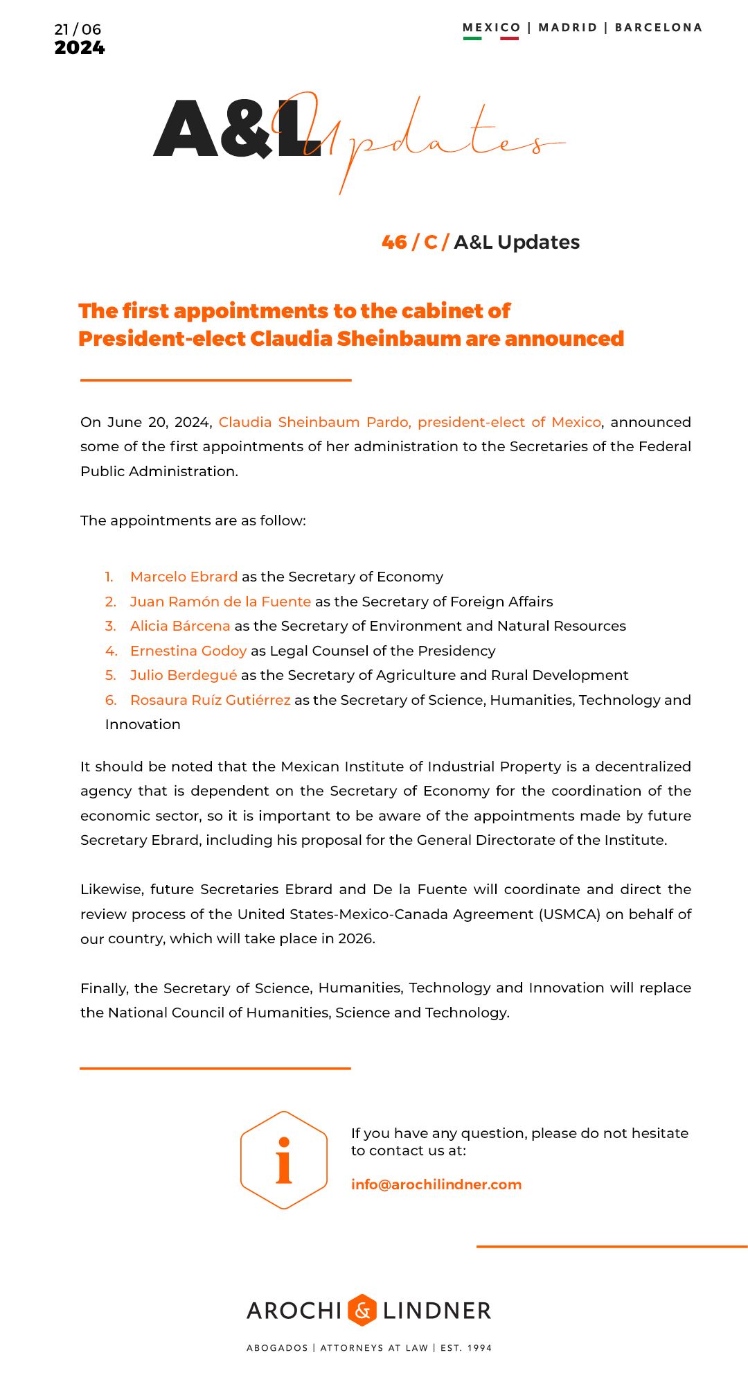 A&L Updates | The first appointments to the cabinet of President-elect Claudia Sheinbaum are announced