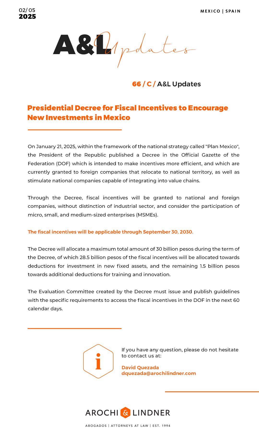 A&L Updates | Presidential Decree for Fiscal Incentives to Encourage New Investments in Mexico