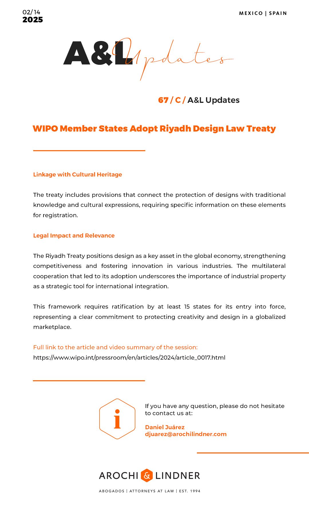 If the Owner wishes to know the details of the processing of personal data, as well as their corresponding rights, they may read the relevant Integral Privacy Notice at https://www.arochilindner.com/en/notice-of-privacy/ or may submit a request to A&L’s Personal Data Department via e-mail: [email protected].